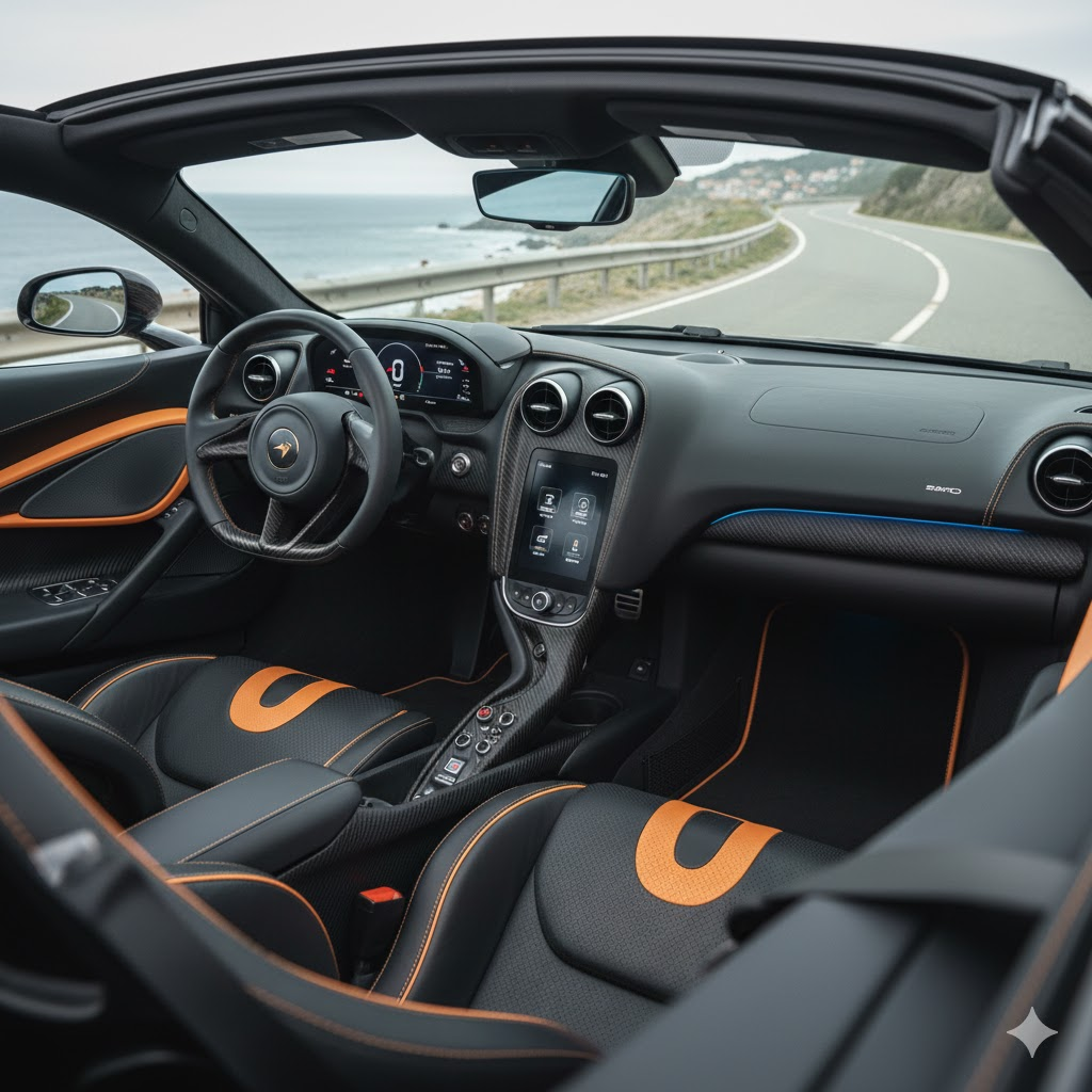 Panel instrumen digital menampilkan informasi lengkap dengan tampilan yang dapat menyesuaikan mode berkendara. Fitur hiburan dilengkapi sistem infotainment layar sentuh yang responsif dengan konektivitas modern. Walaupun interiornya terlihat sederhana, ini menjadi ciri khas McLaren—mengutamakan fokus pada pengemudi.